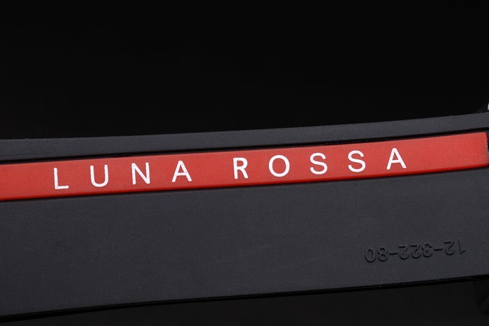 Armband: Strukturiertes schwarzes Gummiband mit Edelstahl-Druckknopf Hakenverschluss, Wärme geprägt RED MOON Gravur und Hublot inscriptions