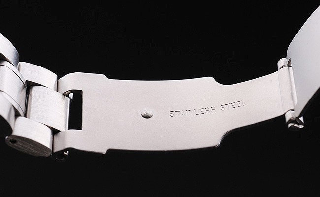 Armband: geschliffener und polierter Edelstahl-Gliederarmband mit Omega Gravuren Druckknopfentriegelung Einsatz clasp