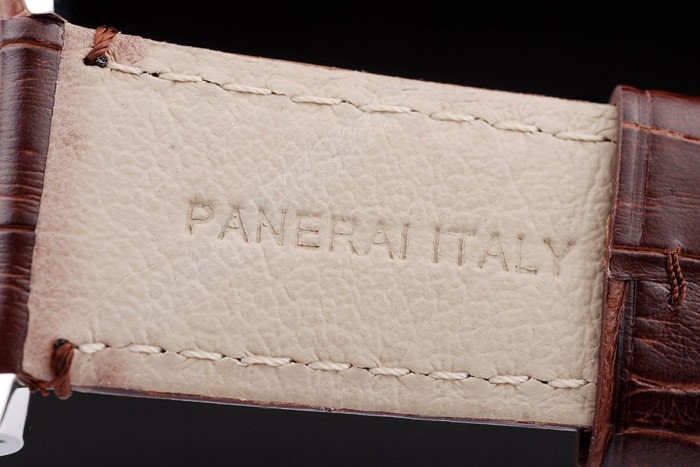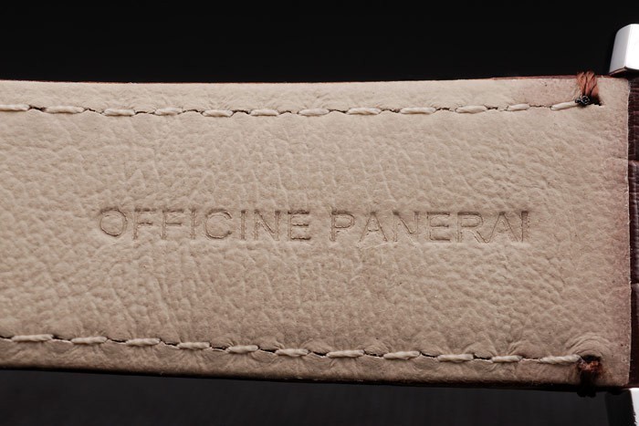 Armband: Braunes Lederarmband mit weißen Nähten und Wärme geprägt Officine Panerai Italien Stempel und poliertem Edelstahl Haken-Schließe mit Panerai engraving