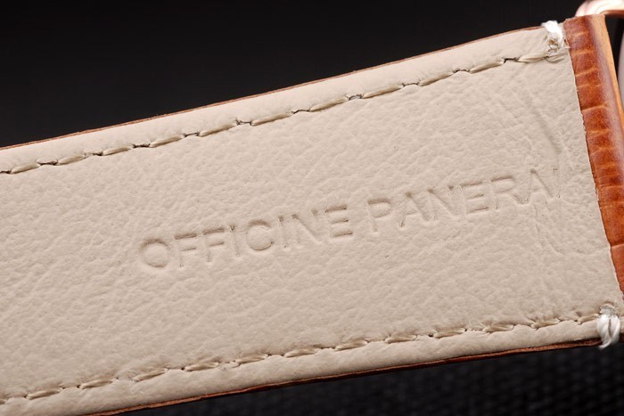 Armband: Braun Krokodillederband mit weißen Nähten und Wärme geprägt Officine Panerai Italien Stempel und 18k Rose vergoldet Haken-Schließe mit Panerai engraving